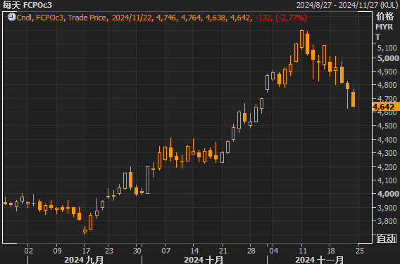 汇通财经APP讯——周五(11月22日),棕榈油期货市场迎来了一周以来最大的跌幅,市场情绪低迷,价格受多个因素拖累,尤其是需求前景的不确定性和大豆油价格的疲软。今日马来西亚棕榈油期货价格下跌132林吉特,收于每吨4640林吉特(约合1039.19美元),较上周五的价格下降了8.81%。这是自2023年4月以来,棕榈油市场最为显著的一次周度跌幅。本文将从基本面和技术面两个角度分析当前棕榈油期货的市场走势,并展望未来趋势。