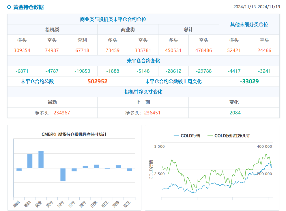 黄金:COMEX黄金投机者减少净多头7038手,至190324手。解读: 尽管黄金价格近期有所波动,但投机者对黄金的净多头减少表明截至11月19日当周,市场对黄金的看涨情绪有所降温。