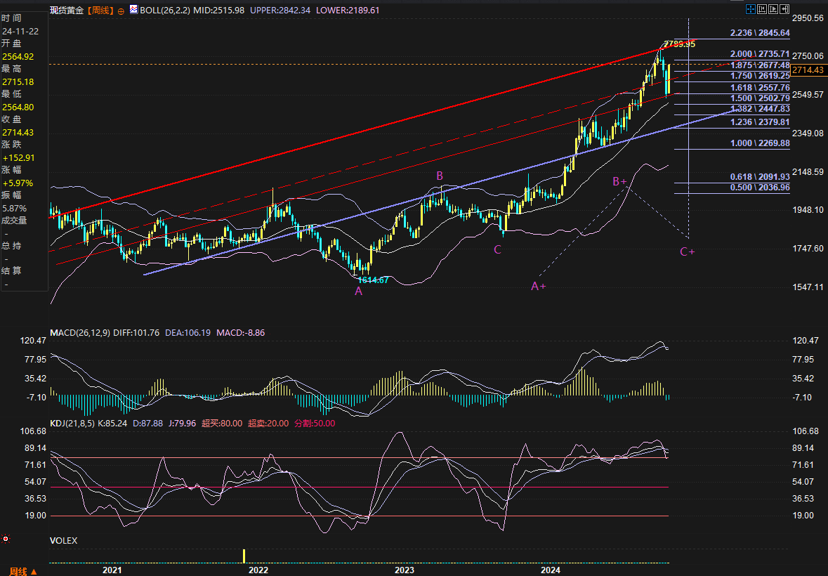 本周(1125-1129当周),金价继续走高的概率几乎是所有人的预期,虽然不排除有冲高回落,但按照目前市场情绪及日K线几乎光头光脚的形态来看,继续朝上测试几乎是一定会发生的事情。最高可能会到2800-2810附近。具体分析如下: