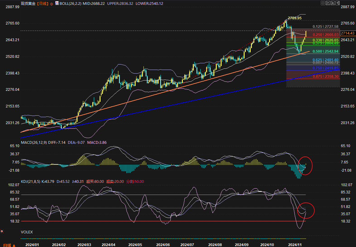 汇通财经APP讯——上周(1118-1122当周),金价五连阳,其中周一和周五都几乎是光头光脚的大阳线,凸显市场在逆转其前两周跌势后的买盘强劲。市场看涨情绪无疑得到极大提升,最新调查是散户和机构一致看涨金价。现货黄金周线收于2714.43美元/盎司,收涨5.97%创20个月最大当周涨幅,当时2023年3月17日当周收涨6.27%。金价在上周收盘前的1个小时内还持续受到买盘支撑且几乎守住了所有涨幅,表明市场投资者没有因为周末的到来变得谨慎而获利了结,也是一种看涨情绪的印证。